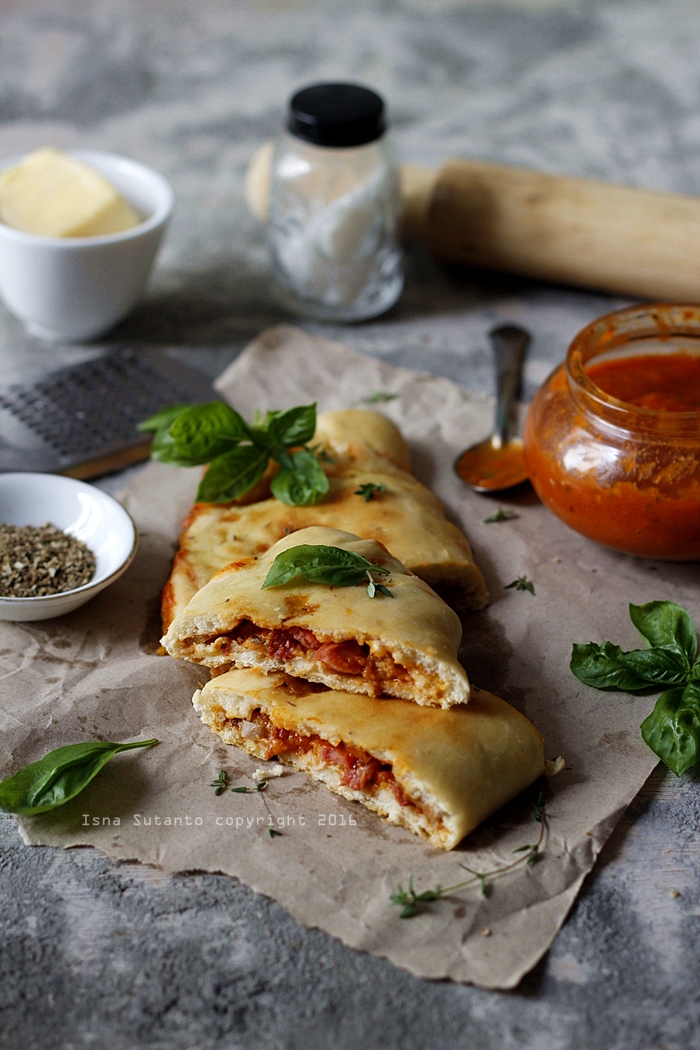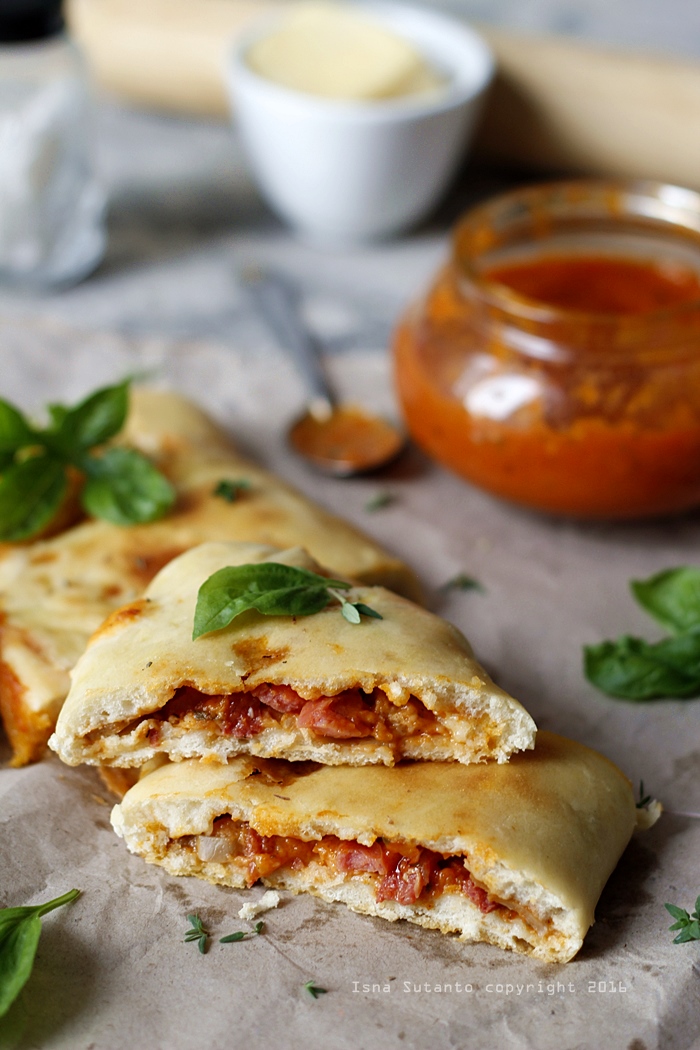 Gilas dough pizza bentuk lingkaran, beri olesan saus pizza, potongan sosis, smokedbeef, jamur, dan keju mozzarella di setengah bagian saja. Lipat dough menutupi bagian isi lalu lipat sisinya atau pilin seperti pastel. Panggang calzone 15-20 menit.
